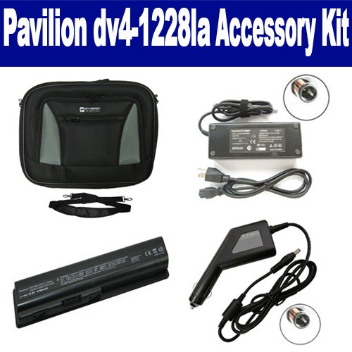 HP Pavilion dv4-1228la Laptop Accessory Kit includes the following items: 1) SDC-32 Laptop 14" Black Case Soft Inner Material With Extra Pocket 2) SDB-3330 Laptop Battery - Lithium-Ion - Ultra High Capacity Rechargeable (6 Cell - 4400 mAh - 49wh - 10.8 Volt) Replacement for HP DV4 Laptop Battery 3) SDA-3515 Laptop Adapter (19 Volt, 4.74 Amp, 90 Watt) 4) SDA-3565 Laptop DC Adapter / Car Charger (19 Volt, 4.74 Amp, 90 Watt)