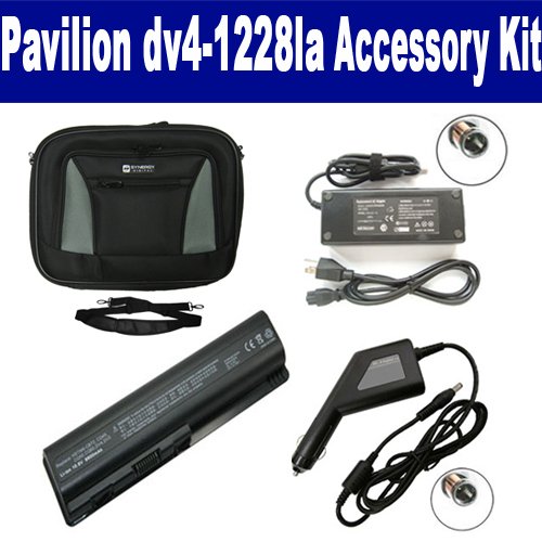 HP Pavilion dv4-1228la Laptop Accessory Kit includes the following items: 1) SDC-32 Laptop 14" Black Case Soft Inner Material With Extra Pocket 2) SDB-3331 Laptop Battery - Lithium-Ion - Ultra High Capacity Rechargeable (12 Cell - 8800 mAh - 98wh - 10.8 Volt) Replacement for HP DV4H Laptop Battery 3) SDA-3515 Laptop Adapter (19 Volt, 4.74 Amp, 90 Watt) 4) SDA-3565 Laptop DC Adapter / Car Charger (19 Volt, 4.74 Amp, 90 Watt)