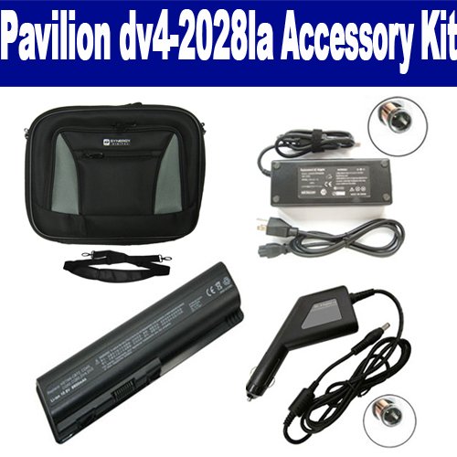 HP Pavilion dv4-2028la Laptop Accessory Kit includes the following items: 1) SDC-32 Laptop 14" Black Case Soft Inner Material With Extra Pocket 2) SDB-3331 Laptop Battery - Lithium-Ion - Ultra High Capacity Rechargeable (12 Cell - 8800 mAh - 98wh - 10.8 Volt) Replacement for HP DV4H Laptop Battery 3) SDA-3515 Laptop Adapter (19 Volt, 4.74 Amp, 90 Watt) 4) SDA-3565 Laptop DC Adapter / Car Charger (19 Volt, 4.74 Amp, 90 Watt)