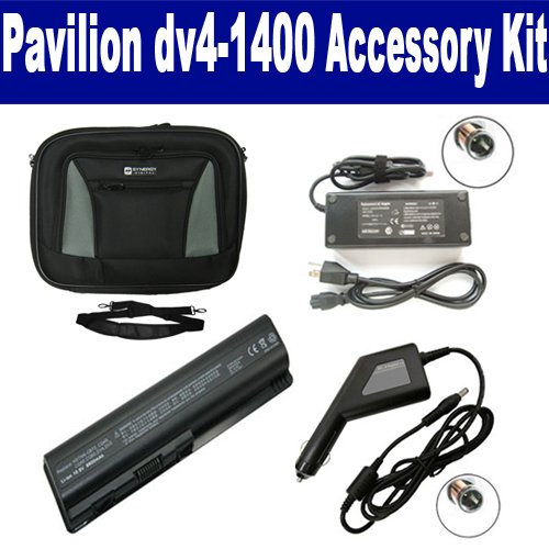 HP Pavilion dv4-1400 Laptop Accessory Kit includes the following items: 1) SDC-32 Laptop 14" Black Case Soft Inner Material With Extra Pocket 2) SDB-3331 Laptop Battery - Lithium-Ion - Ultra High Capacity Rechargeable (12 Cell - 8800 mAh - 98wh - 10.8 Volt) Replacement for HP DV4H Laptop Battery 3) SDA-3515 Laptop Adapter (19 Volt, 4.74 Amp, 90 Watt) 4) SDA-3565 Laptop DC Adapter / Car Charger (19 Volt, 4.74 Amp, 90 Watt)