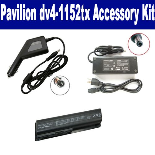 HP Pavilion dv4-1152tx Laptop Accessory Kit includes the following items: 1) SDB-3331 Laptop Battery - Lithium-Ion - Ultra High Capacity Rechargeable (12 Cell - 8800 mAh - 98wh - 10.8 Volt) Replacement for HP DV4H Laptop Battery 2) SDA-3515 Laptop Adapter (19 Volt, 4.74 Amp, 90 Watt) 3) SDA-3565 Laptop DC Adapter / Car Charger (19 Volt, 4.74 Amp, 90 Watt)