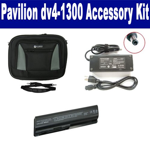 HP Pavilion dv4-1300 Laptop Accessory Kit includes the following items: 1) SDC-32 Laptop 14" Black Case Soft Inner Material With Extra Pocket 2) SDB-3331 Laptop Battery - Lithium-Ion - Ultra High Capacity Rechargeable (12 Cell - 8800 mAh - 98wh - 10.8 Volt) Replacement for HP DV4H Laptop Battery 3) SDA-3515 Laptop Adapter (19 Volt, 4.74 Amp, 90 Watt)