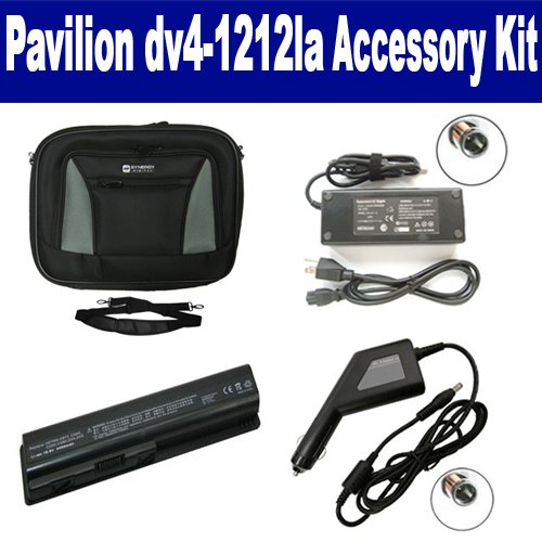 HP Pavilion dv4-1212la Laptop Accessory Kit includes the following items: 1) SDC-32 Laptop 14" Black Case Soft Inner Material With Extra Pocket 2) SDB-3330 Laptop Battery - Lithium-Ion - Ultra High Capacity Rechargeable (6 Cell - 4400 mAh - 49wh - 10.8 Volt) Replacement for HP DV4 Laptop Battery 3) SDA-3515 Laptop Adapter (19 Volt, 4.74 Amp, 90 Watt) 4) SDA-3565 Laptop DC Adapter / Car Charger (19 Volt, 4.74 Amp, 90 Watt)