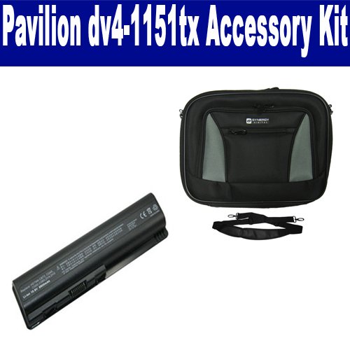HP Pavilion dv4-1151tx Laptop Accessory Kit includes the following items: 1) SDC-32 Laptop 14" Black Case Soft Inner Material With Extra Pocket 2) SDB-3331 Laptop Battery - Lithium-Ion - Ultra High Capacity Rechargeable (12 Cell - 8800 mAh - 98wh - 10.8 Volt) Replacement for HP DV4H Laptop Battery