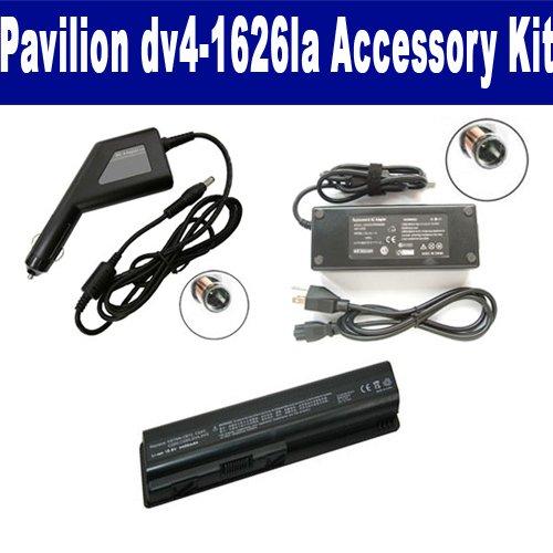HP Pavilion dv4-1626la Laptop Accessory Kit includes the following items: 1) SDB-3330 Laptop Battery - Lithium-Ion - Ultra High Capacity Rechargeable (6 Cell - 4400 mAh - 49wh - 10.8 Volt) Replacement for HP DV4 Laptop Battery 2) SDA-3515 Laptop Adapter (19 Volt, 4.74 Amp, 90 Watt) 3) SDA-3565 Laptop DC Adapter / Car Charger (19 Volt, 4.74 Amp, 90 Watt)
