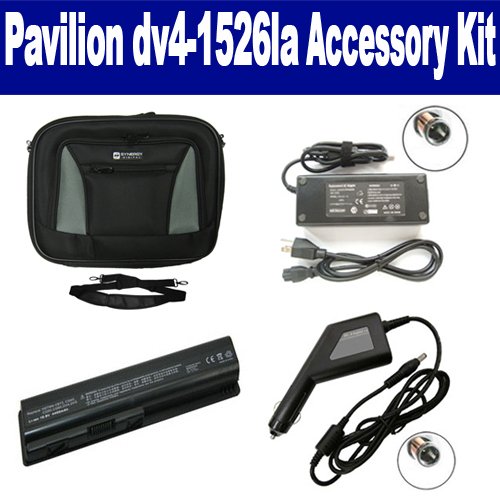 HP Pavilion dv4-1526la Laptop Accessory Kit includes the following items: 1) SDC-32 Laptop 14" Black Case Soft Inner Material With Extra Pocket 2) SDB-3330 Laptop Battery - Lithium-Ion - Ultra High Capacity Rechargeable (6 Cell - 4400 mAh - 49wh - 10.8 Volt) Replacement for HP DV4 Laptop Battery 3) SDA-3515 Laptop Adapter (19 Volt, 4.74 Amp, 90 Watt) 4) SDA-3565 Laptop DC Adapter / Car Charger (19 Volt, 4.74 Amp, 90 Watt)