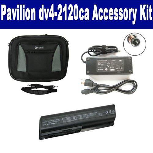 HP Pavilion dv4-2120ca Laptop Accessory Kit includes the following items: 1) SDC-32 Laptop 14" Black Case Soft Inner Material With Extra Pocket 2) SDB-3331 Laptop Battery - Lithium-Ion - Ultra High Capacity Rechargeable (12 Cell - 8800 mAh - 98wh - 10.8 Volt) Replacement for HP DV4H Laptop Battery 3) SDA-3515 Laptop Adapter (19 Volt, 4.74 Amp, 90 Watt)