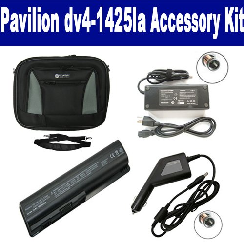 HP Pavilion dv4-1425la Laptop Accessory Kit includes the following items: 1) SDC-32 Laptop 14" Black Case Soft Inner Material With Extra Pocket 2) SDB-3331 Laptop Battery - Lithium-Ion - Ultra High Capacity Rechargeable (12 Cell - 8800 mAh - 98wh - 10.8 Volt) Replacement for HP DV4H Laptop Battery 3) SDA-3515 Laptop Adapter (19 Volt, 4.74 Amp, 90 Watt) 4) SDA-3565 Laptop DC Adapter / Car Charger (19 Volt, 4.74 Amp, 90 Watt)