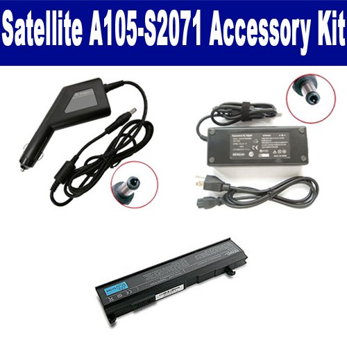 Toshiba Satellite A105-S2071 Laptop Accessory Kit includes the following items: 1) PA3465U Laptop Battery - High-Capacity (4400mAh 6-Cell Lithium-Ion) Replacement For Toshiba PA3465U Rechargeable Laptop Battery 2) SDA-3506 Laptop Adapter (19 Volt, 3.42 Amp, 65 Watt) 3) SDA-3556 Laptop DC Adapter / Car Charger (19 Volt, 3.42 Amp, 65 Watt)
