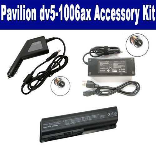 HP Pavilion dv5-1006ax Laptop Accessory Kit includes the following items: 1) SDB-3331 Laptop Battery - Lithium-Ion - Ultra High Capacity Rechargeable (12 Cell - 8800 mAh - 98wh - 10.8 Volt) Replacement for HP DV4H Laptop Battery 2) SDA-3515 Laptop Adapter (19 Volt, 4.74 Amp, 90 Watt) 3) SDA-3565 Laptop DC Adapter / Car Charger (19 Volt, 4.74 Amp, 90 Watt)