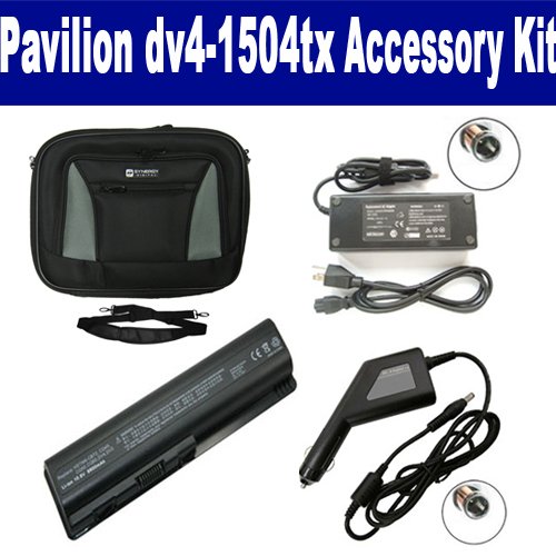 HP Pavilion dv4-1504tx Laptop Accessory Kit includes the following items: 1) SDC-32 Laptop 14" Black Case Soft Inner Material With Extra Pocket 2) SDB-3331 Laptop Battery - Lithium-Ion - Ultra High Capacity Rechargeable (12 Cell - 8800 mAh - 98wh - 10.8 Volt) Replacement for HP DV4H Laptop Battery 3) SDA-3515 Laptop Adapter (19 Volt, 4.74 Amp, 90 Watt) 4) SDA-3565 Laptop DC Adapter / Car Charger (19 Volt, 4.74 Amp, 90 Watt)