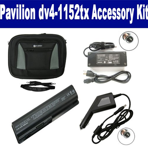 HP Pavilion dv4-1152tx Laptop Accessory Kit includes the following items: 1) SDC-32 Laptop 14" Black Case Soft Inner Material With Extra Pocket 2) SDB-3331 Laptop Battery - Lithium-Ion - Ultra High Capacity Rechargeable (12 Cell - 8800 mAh - 98wh - 10.8 Volt) Replacement for HP DV4H Laptop Battery 3) SDA-3515 Laptop Adapter (19 Volt, 4.74 Amp, 90 Watt) 4) SDA-3565 Laptop DC Adapter / Car Charger (19 Volt, 4.74 Amp, 90 Watt)