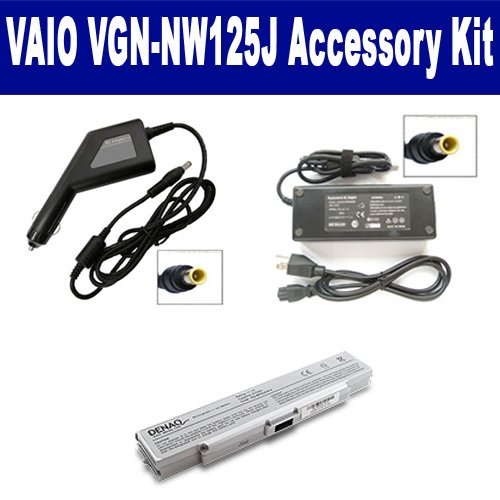 Sony VAIO VGN-NW125J Laptop Accessory Kit includes the following items: 1) VGP-BPS2A/S Laptop Battery - High-Capacity (5200mAh 6-Cell Lithium-Ion) Replacement For Sony VGP-BPS2A/S Rechargeable Laptop Battery 2) SDA-3511 Laptop Adapter (16 Volt, 3.75 Amp, 60 Watt) 3) SDA-3561 Laptop DC Adapter / Car Charger (16 Volt, 3.75 Amp, 60 Watt)