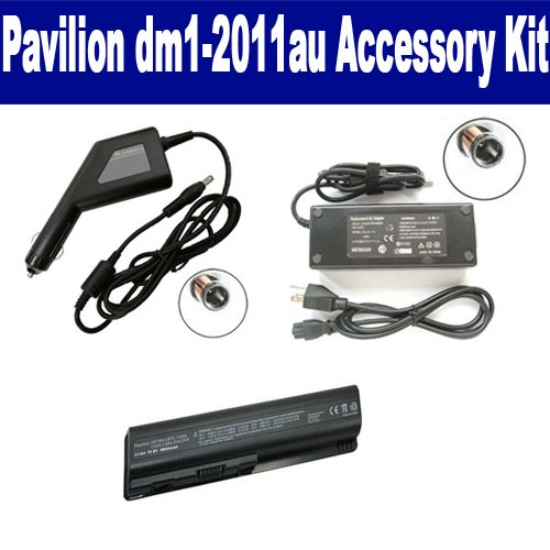 HP Pavilion dm1-2011au Laptop Accessory Kit includes the following items: 1) SDB-3331 Laptop Battery - Lithium-Ion - Ultra High Capacity Rechargeable (12 Cell - 8800 mAh - 98wh - 10.8 Volt) Replacement for HP DV4H Laptop Battery 2) SDA-3516 Laptop Adapter (19.5 Volt, 3.34 Amp, 65 Watt) 3) SDA-3566 Laptop DC Adapter / Car Charger (19.5 Volt, 3.34 Amp, 65 Watt)