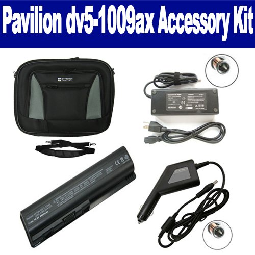 HP Pavilion dv5-1009ax Laptop Accessory Kit includes the following items: 1) SDC-32 Laptop 14" Black Case Soft Inner Material With Extra Pocket 2) SDB-3331 Laptop Battery - Lithium-Ion - Ultra High Capacity Rechargeable (12 Cell - 8800 mAh - 98wh - 10.8 Volt) Replacement for HP DV4H Laptop Battery 3) SDA-3515 Laptop Adapter (19 Volt, 4.74 Amp, 90 Watt) 4) SDA-3565 Laptop DC Adapter / Car Charger (19 Volt, 4.74 Amp, 90 Watt)