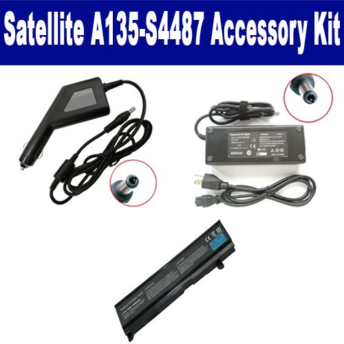 Toshiba Satellite A135-S4487 Laptop Accessory Kit includes the following items: 1) SDB-3347 Laptop Battery - Lithium-Ion - Ultra High Capacity Rechargeable (6 Cell - 4400 mAh - 49wh - 10.8 Volt) Replacement for Toshiba PA3465 Laptop Battery 2) SDA-3506 Laptop Adapter (19 Volt, 3.42 Amp, 65 Watt) 3) SDA-3556 Laptop DC Adapter / Car Charger (19 Volt, 3.42 Amp, 65 Watt)