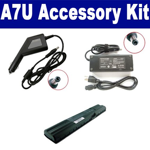 Asus A7U Laptop Accessory Kit includes the following items: 1) A4270-NA51B1100 Laptop Battery (4800mAh 8-Cell Lithium-Ion) - Replacement For Asus A4270-NA51B1100 Rechargeable Laptop Battery 2) SDA-3506 Laptop Adapter (19 Volt, 3.42 Amp, 65 Watt) 3) SDA-3556 Laptop DC Adapter / Car Charger (19 Volt, 3.42 Amp, 65 Watt)