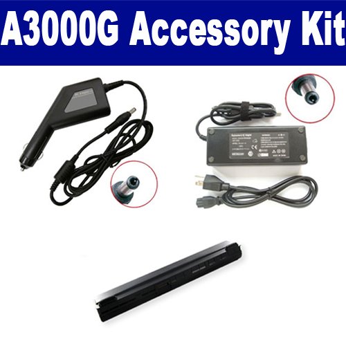Asus A3000G Laptop Accessory Kit includes the following items: 1) Asus A42-A3 Laptop Battery - High-Capacity (4400mAh 14.8V Lithium-Ion) Replacement For Asus A42-A3 Laptop Battery 2) SDA-3506 Laptop Adapter (19 Volt, 3.42 Amp, 65 Watt) 3) SDA-3556 Laptop DC Adapter / Car Charger (19 Volt, 3.42 Amp, 65 Watt)