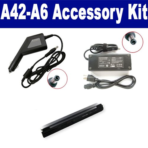 Asus A42-A6 Laptop Accessory Kit includes the following items: 1) Asus A42-A3 Laptop Battery - High-Capacity (4400mAh 14.8V Lithium-Ion) Replacement For Asus A42-A3 Laptop Battery 2) SDA-3506 Laptop Adapter (19 Volt, 3.42 Amp, 65 Watt) 3) SDA-3556 Laptop DC Adapter / Car Charger (19 Volt, 3.42 Amp, 65 Watt)
