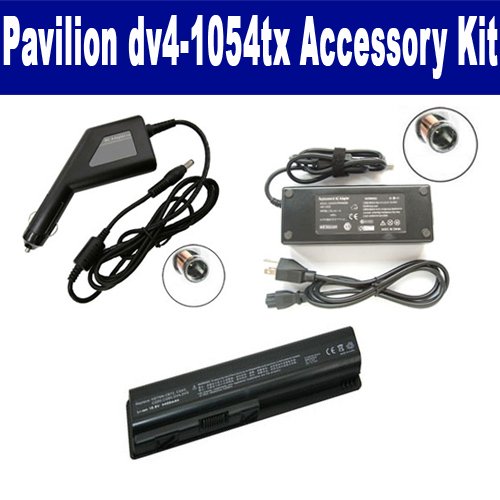 HP Pavilion dv4-1054tx Laptop Accessory Kit includes the following items: 1) SDB-3330 Laptop Battery - Lithium-Ion - Ultra High Capacity Rechargeable (6 Cell - 4400 mAh - 49wh - 10.8 Volt) Replacement for HP DV4 Laptop Battery 2) SDA-3515 Laptop Adapter (19 Volt, 4.74 Amp, 90 Watt) 3) SDA-3565 Laptop DC Adapter / Car Charger (19 Volt, 4.74 Amp, 90 Watt)