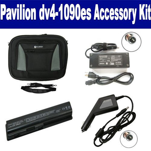 HP Pavilion dv4-1090es Laptop Accessory Kit includes the following items: 1) SDC-32 Laptop 14" Black Case Soft Inner Material With Extra Pocket 2) SDB-3330 Laptop Battery - Lithium-Ion - Ultra High Capacity Rechargeable (6 Cell - 4400 mAh - 49wh - 10.8 Volt) Replacement for HP DV4 Laptop Battery 3) SDA-3515 Laptop Adapter (19 Volt, 4.74 Amp, 90 Watt) 4) SDA-3565 Laptop DC Adapter / Car Charger (19 Volt, 4.74 Amp, 90 Watt)