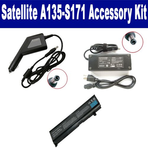Toshiba Satellite A105-S171 Laptop Accessory Kit includes the following items: 1) SDB-3347 Laptop Battery - Lithium-Ion - Ultra High Capacity Rechargeable (6 Cell - 4400 mAh - 49wh - 10.8 Volt) Replacement for Toshiba PA3465 Laptop Battery 2) SDA-3506 Laptop Adapter (19 Volt, 3.42 Amp, 65 Watt) 3) SDA-3556 Laptop DC Adapter / Car Charger (19 Volt, 3.42 Amp, 65 Watt)