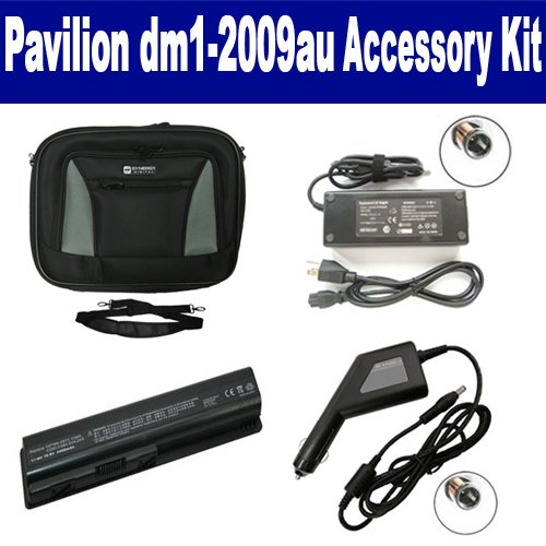 HP Pavilion dm1-2009au Laptop Accessory Kit includes the following items: 1) SDB-3330 Laptop Battery - Lithium-Ion - Ultra High Capacity Rechargeable (6 Cell - 4400 mAh - 49wh - 10.8 Volt) Replacement for HP DV4 Laptop Battery 2) SDC-31 Laptop 10" Black Case Soft Inner Material With Extra Pocket 3) SDA-3516 Laptop Adapter (19.5 Volt, 3.34 Amp, 65 Watt) 4) SDA-3566 Laptop DC Adapter / Car Charger (19.5 Volt, 3.34 Amp, 65 Watt)