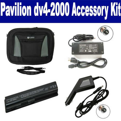 HP Pavilion dv4-2000 Laptop Accessory Kit includes the following items: 1) SDC-32 Laptop 14" Black Case Soft Inner Material With Extra Pocket 2) SDB-3330 Laptop Battery - Lithium-Ion - Ultra High Capacity Rechargeable (6 Cell - 4400 mAh - 49wh - 10.8 Volt) Replacement for HP DV4 Laptop Battery 3) SDA-3515 Laptop Adapter (19 Volt, 4.74 Amp, 90 Watt) 4) SDA-3565 Laptop DC Adapter / Car Charger (19 Volt, 4.74 Amp, 90 Watt)