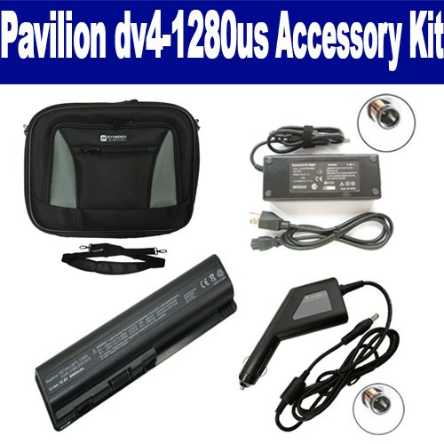 HP Pavilion dv4-1280us Laptop Accessory Kit includes the following items: 1) SDC-32 Laptop 14" Black Case Soft Inner Material With Extra Pocket 2) SDB-3331 Laptop Battery - Lithium-Ion - Ultra High Capacity Rechargeable (12 Cell - 8800 mAh - 98wh - 10.8 Volt) Replacement for HP DV4H Laptop Battery 3) SDA-3515 Laptop Adapter (19 Volt, 4.74 Amp, 90 Watt) 4) SDA-3565 Laptop DC Adapter / Car Charger (19 Volt, 4.74 Amp, 90 Watt)
