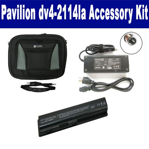 HP Pavilion dv4-2114la Laptop Accessory Kit includes the following items: 1) SDC-32 Laptop 14" Black Case Soft Inner Material With Extra Pocket 2) SDB-3330 Laptop Battery - Lithium-Ion - Ultra High Capacity Rechargeable (6 Cell - 4400 mAh - 49wh - 10.8 Volt) Replacement for HP DV4 Laptop Battery 3) SDA-3515 Laptop Adapter (19 Volt, 4.74 Amp, 90 Watt)