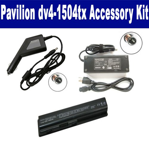 HP Pavilion dv4-1504tx Laptop Accessory Kit includes the following items: 1) SDB-3330 Laptop Battery - Lithium-Ion - Ultra High Capacity Rechargeable (6 Cell - 4400 mAh - 49wh - 10.8 Volt) Replacement for HP DV4 Laptop Battery 2) SDA-3515 Laptop Adapter (19 Volt, 4.74 Amp, 90 Watt) 3) SDA-3565 Laptop DC Adapter / Car Charger (19 Volt, 4.74 Amp, 90 Watt)