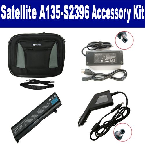 Toshiba Satellite A135-S2396 Laptop Accessory Kit includes the following items: 1) SDC-32 Laptop 14" Black Case Soft Inner Material With Extra Pocket 2) SDB-3347 Laptop Battery - Lithium-Ion - Ultra High Capacity Rechargeable (6 Cell - 4400 mAh - 49wh - 10.8 Volt) Replacement for Toshiba PA3465 Laptop Battery 3) SDA-3506 Laptop Adapter (19 Volt, 3.42 Amp, 65 Watt) 4) SDA-3556 Laptop DC Adapter / Car Charger (19 Volt, 3.42 Amp, 65 Watt)