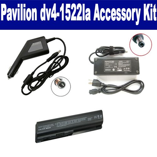 HP Pavilion dv4-1522la Laptop Accessory Kit includes the following items: 1) SDB-3331 Laptop Battery - Lithium-Ion - Ultra High Capacity Rechargeable (12 Cell - 8800 mAh - 98wh - 10.8 Volt) Replacement for HP DV4H Laptop Battery 2) SDA-3515 Laptop Adapter (19 Volt, 4.74 Amp, 90 Watt) 3) SDA-3565 Laptop DC Adapter / Car Charger (19 Volt, 4.74 Amp, 90 Watt)