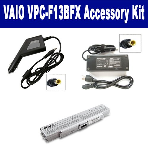 Sony VAIO VPC-F13BFX Laptop Accessory Kit includes the following items: 1) VGP-BPS2A/S Laptop Battery - High-Capacity (5200mAh 6-Cell Lithium-Ion) Replacement For Sony VGP-BPS2A/S Rechargeable Laptop Battery 2) SDA-3511 Laptop Adapter (16 Volt, 3.75 Amp, 60 Watt) 3) SDA-3561 Laptop DC Adapter / Car Charger (16 Volt, 3.75 Amp, 60 Watt)