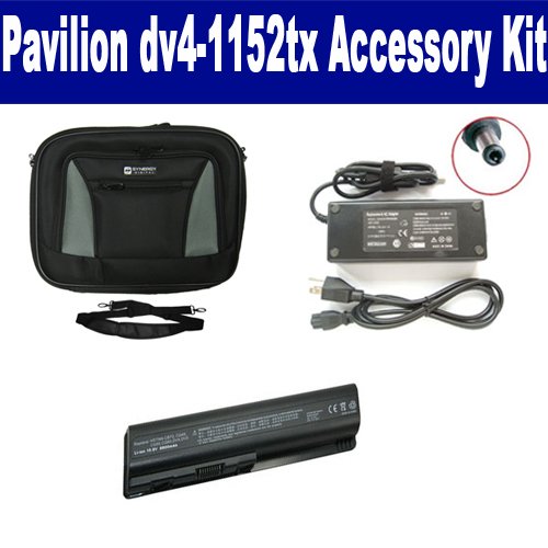 HP Pavilion dv4-1152tx Laptop Accessory Kit includes the following items: 1) SDC-32 Laptop 14" Black Case Soft Inner Material With Extra Pocket 2) SDB-3331 Laptop Battery - Lithium-Ion - Ultra High Capacity Rechargeable (12 Cell - 8800 mAh - 98wh - 10.8 Volt) Replacement for HP DV4H Laptop Battery 3) SDA-3515 Laptop Adapter (19 Volt, 4.74 Amp, 90 Watt)