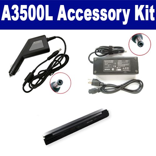 Asus A3500L Laptop Accessory Kit includes the following items: 1) Asus A42-A3 Laptop Battery - High-Capacity (4400mAh 14.8V Lithium-Ion) Replacement For Asus A42-A3 Laptop Battery 2) SDA-3506 Laptop Adapter (19 Volt, 3.42 Amp, 65 Watt) 3) SDA-3556 Laptop DC Adapter / Car Charger (19 Volt, 3.42 Amp, 65 Watt)