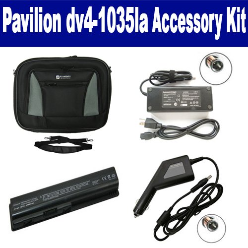 HP Pavilion dv4-1035la Laptop Accessory Kit includes the following items: 1) SDC-32 Laptop 14" Black Case Soft Inner Material With Extra Pocket 2) SDB-3330 Laptop Battery - Lithium-Ion - Ultra High Capacity Rechargeable (6 Cell - 4400 mAh - 49wh - 10.8 Volt) Replacement for HP DV4 Laptop Battery 3) SDA-3515 Laptop Adapter (19 Volt, 4.74 Amp, 90 Watt) 4) SDA-3565 Laptop DC Adapter / Car Charger (19 Volt, 4.74 Amp, 90 Watt)