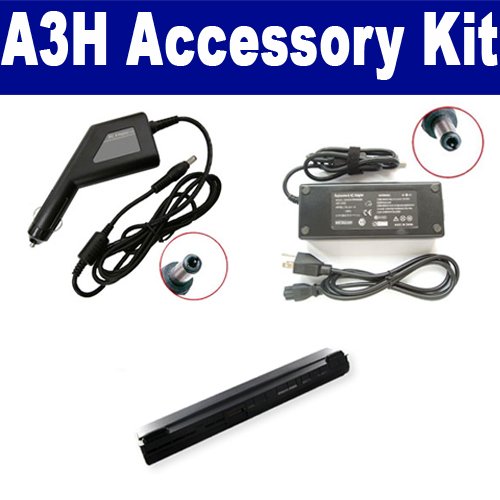 Asus A3H Laptop Accessory Kit includes the following items: 1) Asus A42-A3 Laptop Battery - High-Capacity (4400mAh 14.8V Lithium-Ion) Replacement For Asus A42-A3 Laptop Battery 2) SDA-3506 Laptop Adapter (19 Volt, 3.42 Amp, 65 Watt) 3) SDA-3556 Laptop DC Adapter / Car Charger (19 Volt, 3.42 Amp, 65 Watt)