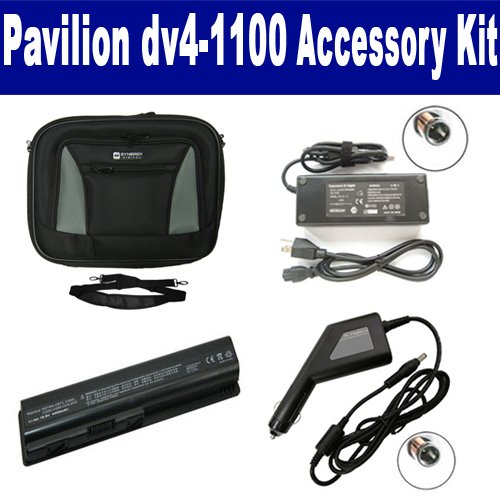 HP Pavilion dv4-1100 Laptop Accessory Kit includes the following items: 1) SDC-32 Laptop 14" Black Case Soft Inner Material With Extra Pocket 2) SDB-3330 Laptop Battery - Lithium-Ion - Ultra High Capacity Rechargeable (6 Cell - 4400 mAh - 49wh - 10.8 Volt) Replacement for HP DV4 Laptop Battery 3) SDA-3515 Laptop Adapter (19 Volt, 4.74 Amp, 90 Watt) 4) SDA-3565 Laptop DC Adapter / Car Charger (19 Volt, 4.74 Amp, 90 Watt)