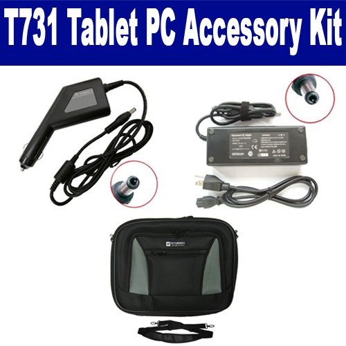 Fujitsu T731 Tablet PC Laptop Accessory Kit includes the following items: 1) SDA-3508 Laptop Adapter (19 Volt, 4.74 Amp, 90 Watt) 2) SDA-3558 Laptop DC Adapter / Car Charger (19 Volt, 4.74 Amp, 90 Watt) 3) SDC-32 Laptop 14" Black Case Soft Inner Material With Extra Pocket